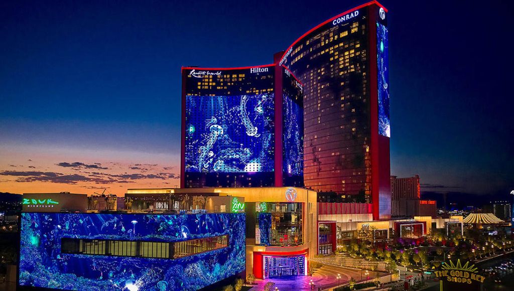 Zupełnie inne podejście zaprezentowano w przypadku kompleksu Resorts World, gdzie technologia została wpleciona bezpośrednio w architekturę hotelu. Zamiast jednej bryły mamy tutaj do czynienia z systemem trzech zsynchronizowanych wyświetlaczy, z których największy zajmuje fasadę zachodniej wieży.